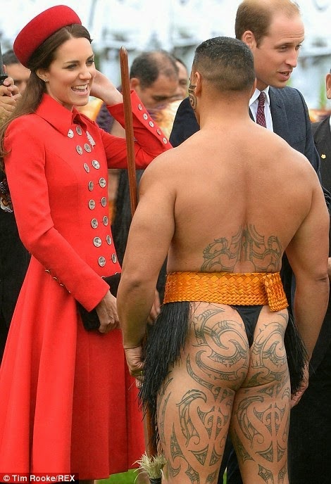 Kate Middleton and Prince William began their 3-week royal tour of New Zealand and Australia today Monday April 7th, and were greeted by half-naked traditional Maori warriors at New Zealand Government House in Wellington. See the way she's checking the guy out. Bad princess...lol.